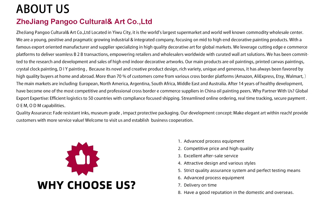 We focus on high-quality wall art decoration items, including DIY painting by numbers, diamond paintings, handmade oil paintings, and printed canvas art. With over 13 years of professional trade experience, we provide competitive pricing and professional service.